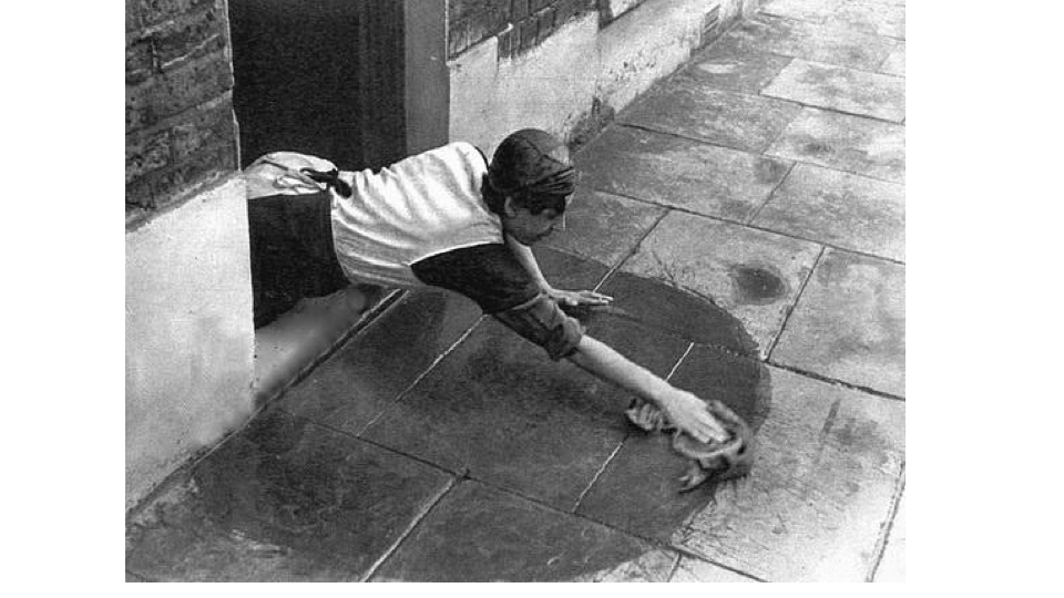Cleaning the pavement like this, in front of the threshold, was a mark of working class pride and respectability.